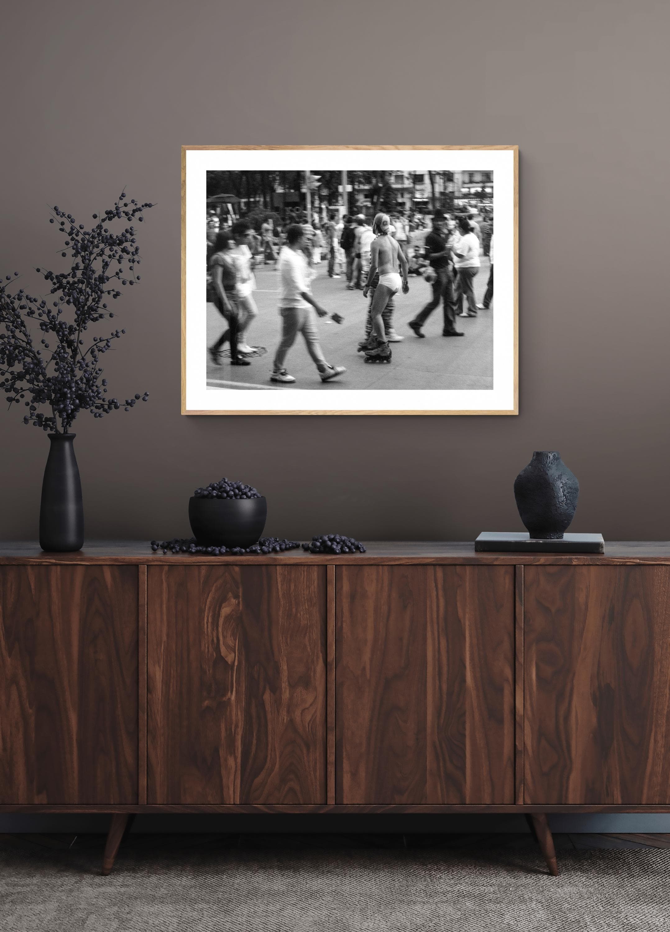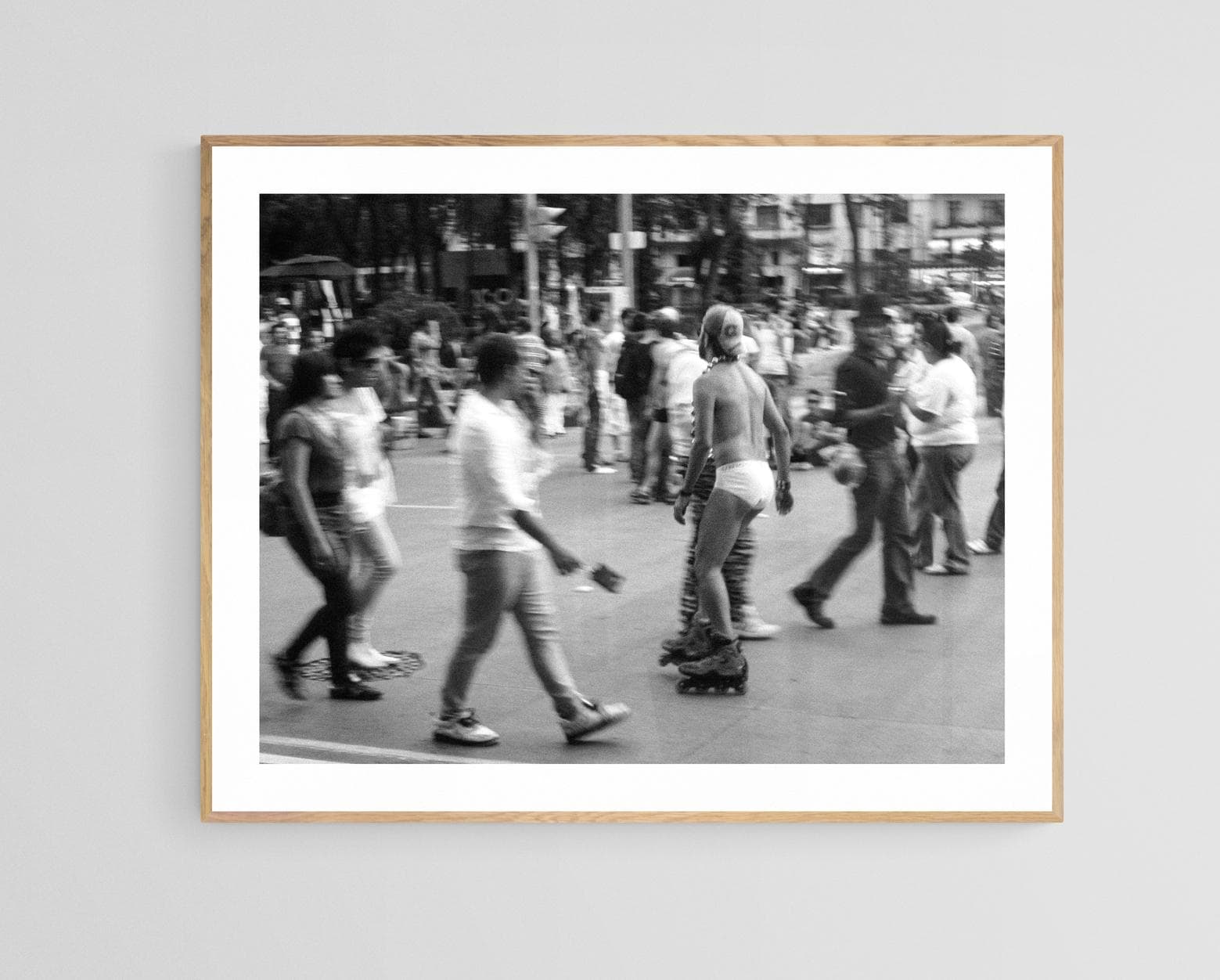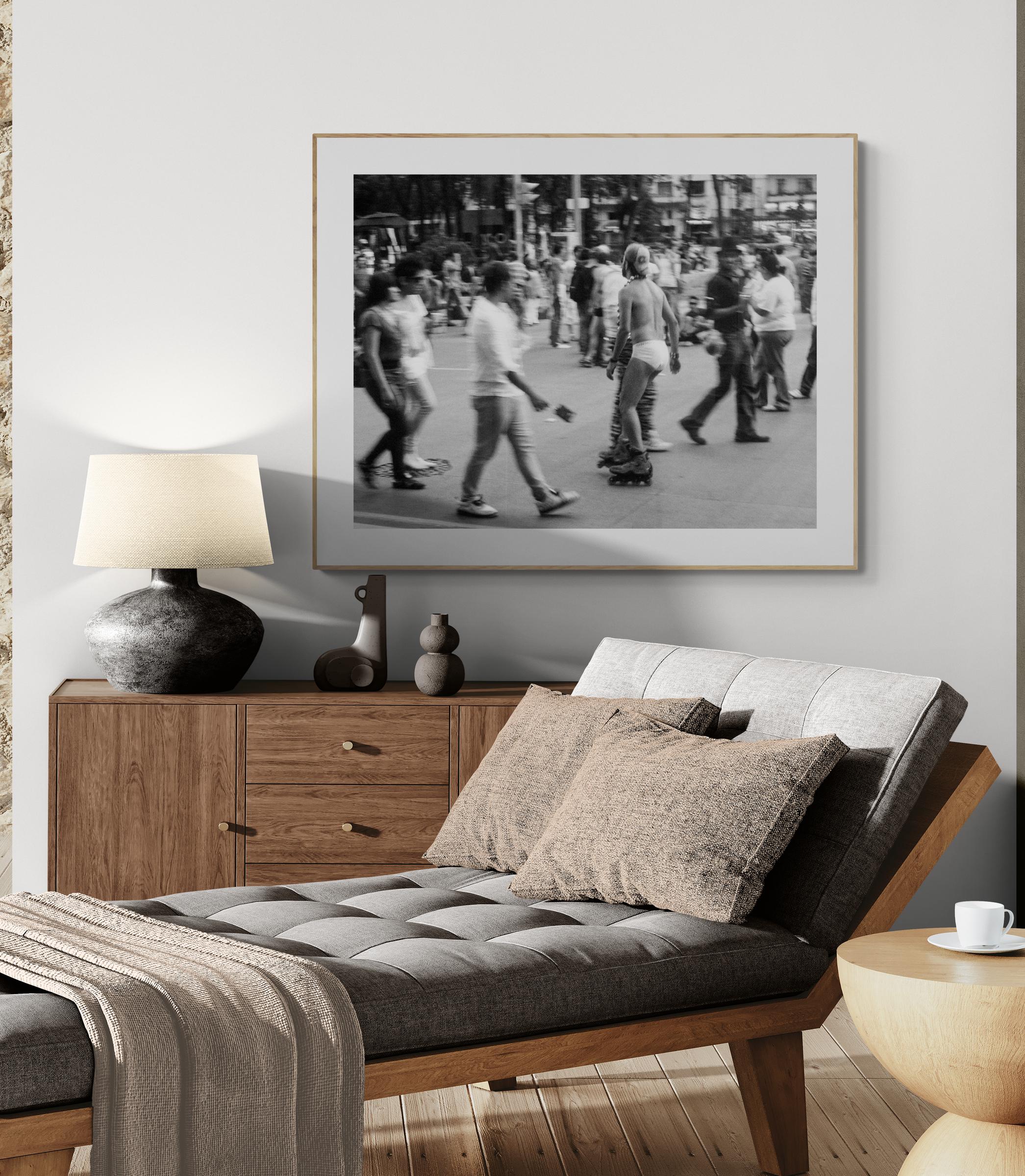 On Paseo de la Reforma, Mexico City, 2010, a figure glides through the crowd on rollerblades — in briefs and a helmet, unbothered, almost regal. Around him pedestrians hustle, blurred by motion, bound by the ordinary rhythm of the street. He moves through it all on his own timeline.